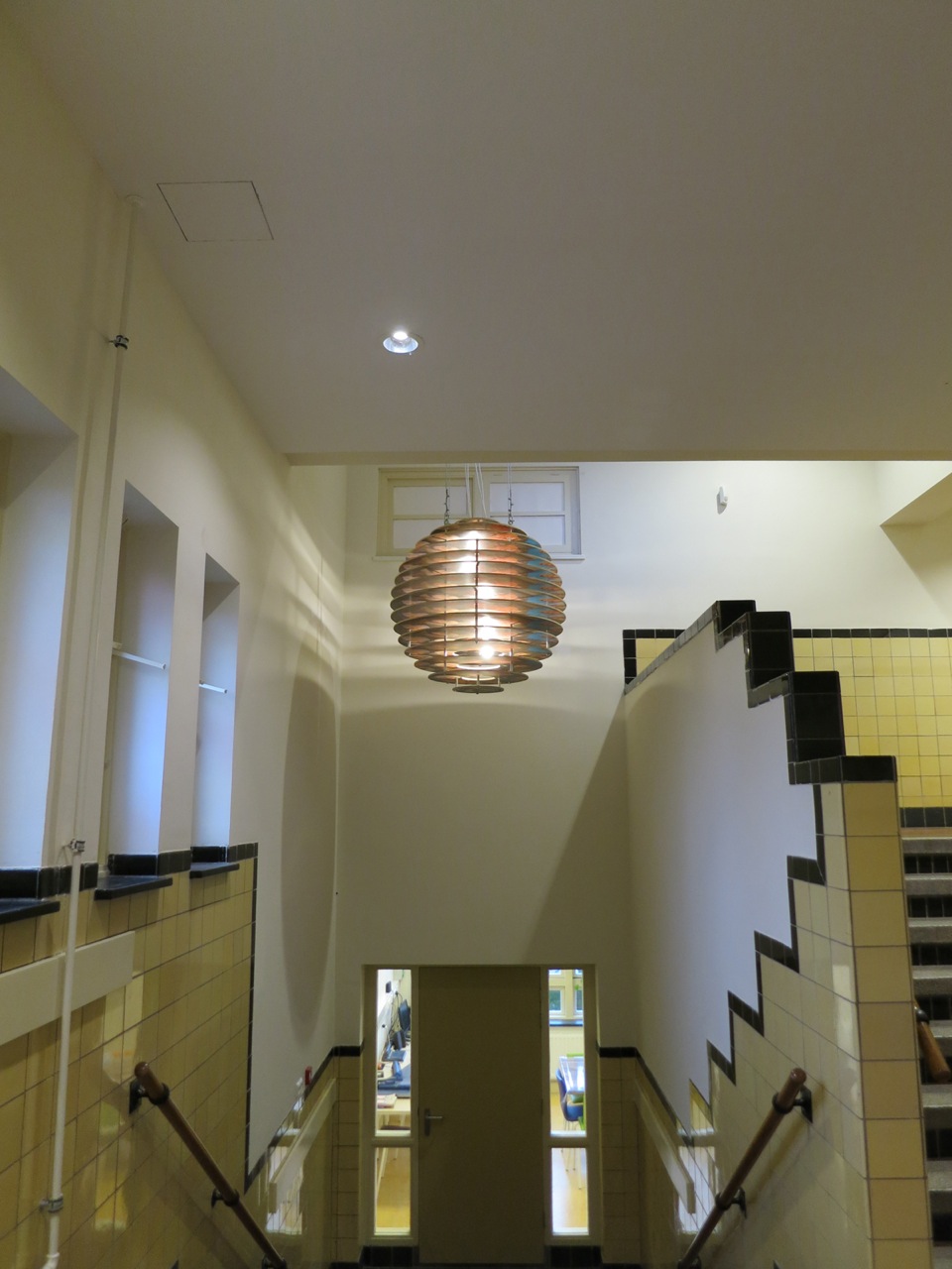 Bas de Boer made two special lamps for OBS de Vlierboom. He made photos of the monumental stained glass window and a group photo of the teachers in bird's eye view. The photos were pasted onto large round wooden discs, creating a prism-like experience from below. Because of the many staircases, alcoves and windows in the school building, the lamps can be seen from many different angles, providing a different image each time.