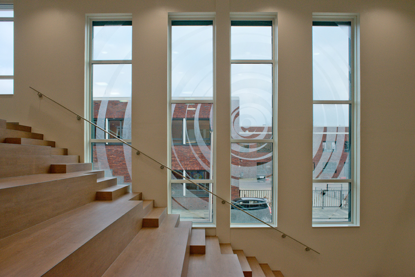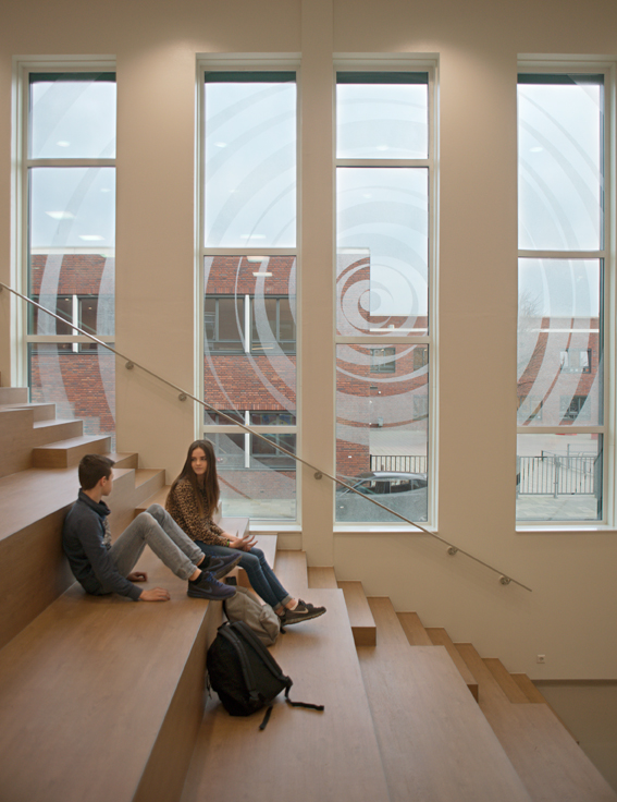 Nutsschool M.M. Boldingh and Christelijk College de Populier MAVO share the same new building. It is a marriage of for the two schools. The artist Bob Waardenburg was invited to create a new public artwork for the new school building. He designed a spiral-shaped Vortex, which was engraved by hand in the windows and walls made of glass.