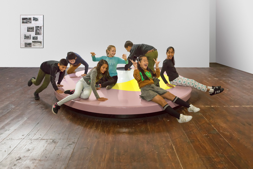 With Proposals for a Qualitative Society (Spinning) (2017) Céline Condorelli presented Stroom's exhibition space as a place for rehearsal and play. A series of carousels and spinning tops invited visitors to play and interact with them, while (historical) references of radical playground designs showed what play means for the city and for society. The two carousels were later installed in the schoolyards of IBS Yunus Emre and Nutsschool Morgenstond. The children of these schools were actively involved as researchers throughout the process and development of the exhibition.