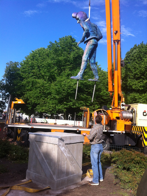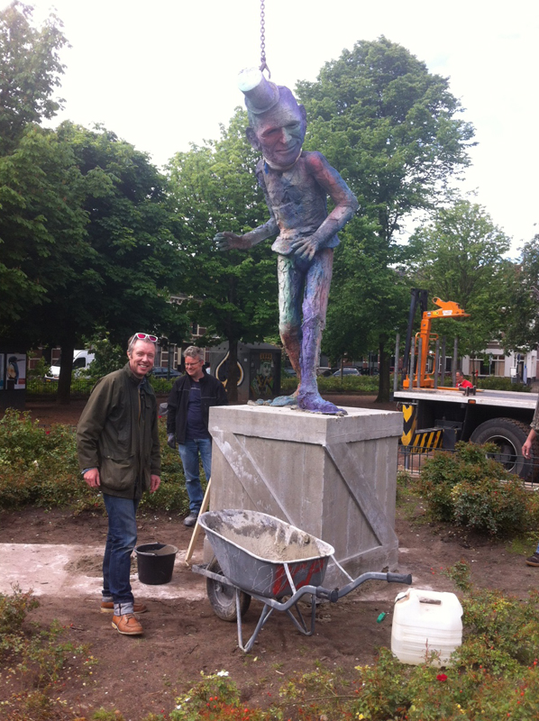 homestroom den haagprogrammakunst en de stedelijke omgevingsubsidies, documentatie en atelierskenniscentrumPublicatieseducatiepers archiefzoekenglish Folkert de Jong ‘De Speler’ Koningsplein, Den Haag Locatie: Koningsplein, Den Haag Onthulling: zaterdag 21 juni 2014, 14 uur door wethouder Ingrid van Engelshoven, gevolgd door een feestelijke middag met kinderspelen Fotoalbum van de onthulling Op zaterdag 21 juni 2014 werd het beeld De Speler van kunstenaar Folkert de Jong op het Koningsplein in Den Haag onthuld door Ingrid van Engelshoven (wethouder Onderwijs en Dienstverlening). Gedurende de feestelijke middag organiseerde het bewonerscomité op het plein tal van kinderspelen. Na het jarenlang pleidooi van omwonenden krijgt het Koningsplein eindelijk weer een markant kunstwerk. Spelende kinderen en ouders op bankjes zijn het nieuwe publiek van de nar van het Koningsplein. Ooit de locatie van Horse Power, een parodie op een klassiek ruiterstandbeeld van de Israëlische kunstenaar Zadok Ben-David, stond er nu al jarenlang slechts een lege sokkel op het Koningsplein. Omwonenden wilden graag weer een nieuw kunstwerk. Men wilde een kunstenaar die het Koningsplein kon 'verbijzonderen', iemand die de identiteit van de buurt (zelf samengevat als ‘allure vs kneuterigheid') in een aansprekend beeld wist te vatten passend ook bij het karakter van het plein. Een delegatie - geformeerd in een kunstcommissie - koos er onder begeleiding van Stroom Den Haag uiteindelijk voor, om Folkert de Jong een nieuw beeld te laten maken. In de beelden van Folkert de Jong figureren historische figuren in soms groteske taferelen. Door het gebruik van kleurige maar kwetsbare kunststoffen waren zijn beelden niet eerder permanent in de openbare ruimte te zien. Het beeld voor het Koningsplein, en het werken met meer klassieke materialen zoals brons, was voor de kunstenaar dan ook een uitdaging. De hofnar en diens ambivalente verhouding tot het hof vormde de inspiratiebron voor De Speler; de hofnar mag de koning bespotten maar is tegelijk afhankelijk van hem als werkgever. Om de trekken van De Speler naar het nu te halen keek de kunstenaar naar de koppen van acteurs als Willem Dafoe en Klaus Kinski. Het beeld neemt met z'n verstilde houding - als in het oog van de storm - een centrale plek in op het drukke plein, waar het zowel koning als nar kan spelen. www.folkertdejong.org PERS Konkreetnieuws, februari 2019 Den Haag Centraal, 27 juni 2014 KonKreet (wijkkrant Regentes/Valkenbos), juni 2014 if then is now, 28 mei 2014 21 Jun '14 Folkert de Jong, 'De Speler' foto: Gerrit Schreurs, courtesy Stroom Den Haag Folkert de Jong, 'De Speler' foto: Gerrit Schreurs, courtesy Stroom Den Haag Onthulling 'De Speler' op 21 juni 2014 foto: Eric de Vries, courtesy Stroom Den Haag
