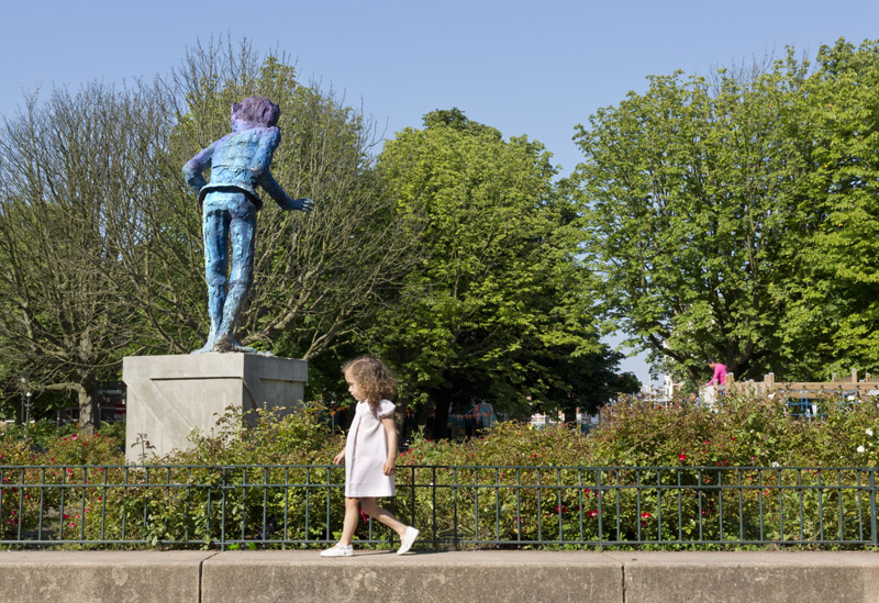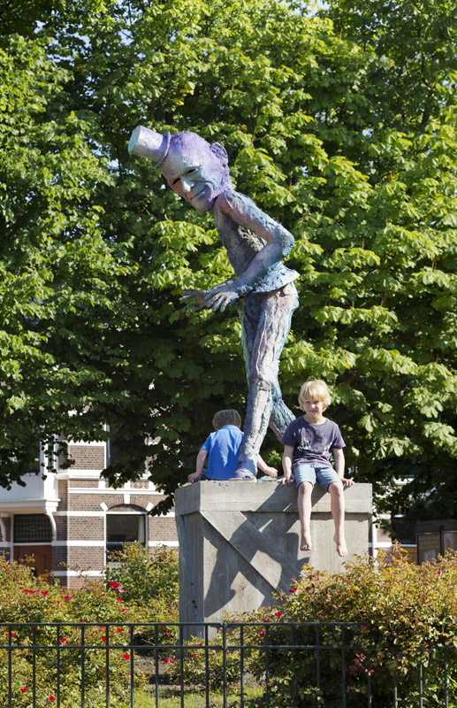 homestroom den haagprogrammakunst en de stedelijke omgevingsubsidies, documentatie en atelierskenniscentrumPublicatieseducatiepers archiefzoekenglish  Folkert de Jong ‘De Speler’ Koningsplein, Den Haag Locatie: Koningsplein, Den Haag Onthulling: zaterdag 21 juni 2014, 14 uur door wethouder Ingrid van Engelshoven, gevolgd door een feestelijke middag met kinderspelen Fotoalbum van de onthulling  Op zaterdag 21 juni 2014 werd het beeld De Speler van kunstenaar Folkert de Jong op het Koningsplein in Den Haag onthuld door Ingrid van Engelshoven (wethouder Onderwijs en Dienstverlening). Gedurende de feestelijke middag organiseerde het bewonerscomité op het plein tal van kinderspelen. Na het jarenlang pleidooi van omwonenden krijgt het Koningsplein eindelijk weer een markant kunstwerk. Spelende kinderen en ouders op bankjes zijn het nieuwe publiek van de nar van het Koningsplein.  Ooit de locatie van Horse Power, een parodie op een klassiek ruiterstandbeeld van de Israëlische kunstenaar Zadok Ben-David, stond er nu al jarenlang slechts een lege sokkel op het Koningsplein. Omwonenden wilden graag weer een nieuw kunstwerk. Men wilde een kunstenaar die het Koningsplein kon 'verbijzonderen', iemand die de identiteit van de buurt (zelf samengevat als ‘allure vs kneuterigheid') in een aansprekend beeld wist te vatten passend ook bij het karakter van het plein. Een delegatie - geformeerd in een kunstcommissie - koos er onder begeleiding van Stroom Den Haag uiteindelijk voor, om Folkert de Jong een nieuw beeld te laten maken.  In de beelden van Folkert de Jong figureren historische figuren in soms groteske taferelen. Door het gebruik van kleurige maar kwetsbare kunststoffen waren zijn beelden niet eerder permanent in de openbare ruimte te zien. Het beeld voor het Koningsplein, en het werken met meer klassieke materialen zoals brons, was voor de kunstenaar dan ook een uitdaging. De hofnar en diens ambivalente verhouding tot het hof vormde de inspiratiebron voor De Speler; de hofnar mag de koning bespotten maar is tegelijk afhankelijk van hem als werkgever. Om de trekken van De Speler naar het nu te halen keek de kunstenaar naar de koppen van acteurs als Willem Dafoe en Klaus Kinski. Het beeld neemt met z'n verstilde houding - als in het oog van de storm - een centrale plek in op het drukke plein, waar het zowel koning als nar kan spelen.  www.folkertdejong.org   PERS Konkreetnieuws, februari 2019 Den Haag Centraal, 27 juni 2014 KonKreet (wijkkrant Regentes/Valkenbos), juni 2014 if then is now, 28 mei 2014 21 Jun '14  Folkert de Jong, 'De Speler' foto: Gerrit Schreurs, courtesy Stroom Den Haag  Folkert de Jong, 'De Speler' foto: Gerrit Schreurs, courtesy Stroom Den Haag  Onthulling 'De Speler' op 21 juni 2014 foto: Eric de Vries, courtesy Stroom Den Haag