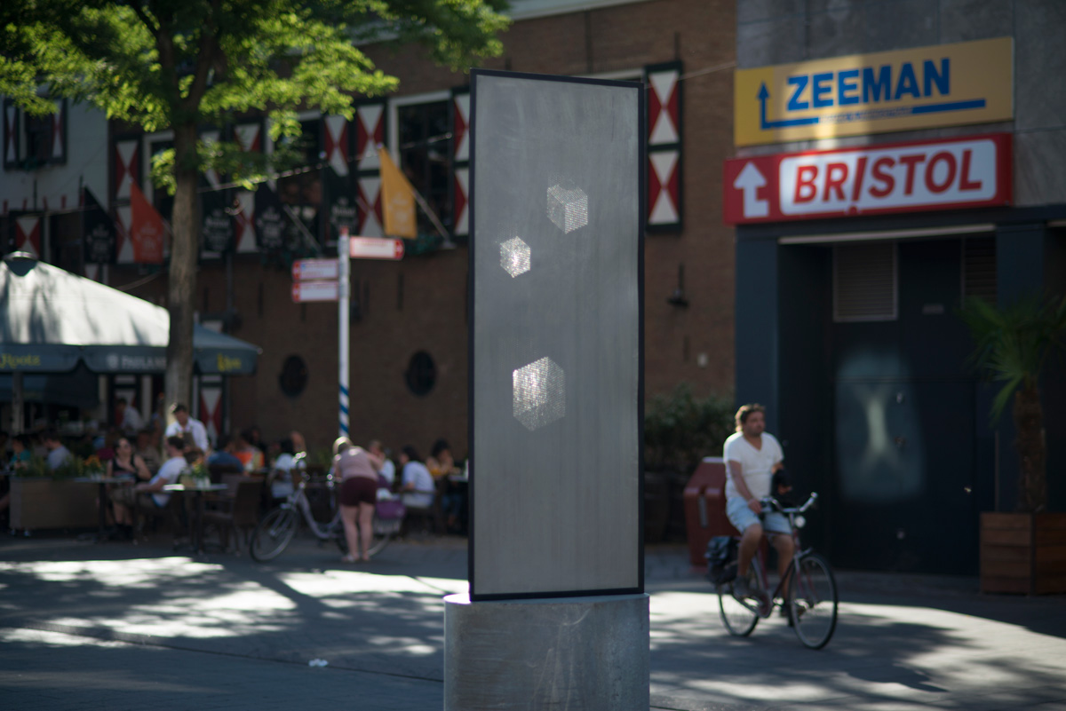 Gabriel Lester's Bambaataa is a large black metal sculpture with a triangular form, featuring three cube-shaped elements made of light gray mesh. On one side, it displays a mask-like face, with the eyes and mouth allowing sunlight to pass through. This creates holographic projections of geometric shapes on the opposite side. Although it is a sculpture, it retains a photographic and cinematic quality in line with Lester's body of work: its appearance changes depending on the lighting and the viewer's perspective. The sculpture is placed on Grote Marktstraat, precisely in the southeast—when the sun sets, it shines directly on the sculpture like a spotlight.