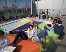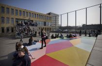 Like a flattened, multicolored diamond, artist George Korsmit designed a stage at the entrance for Maris College Houtrust. The stage is in keeping with the school's musical tradition and is an ideal place to hang out and chill.