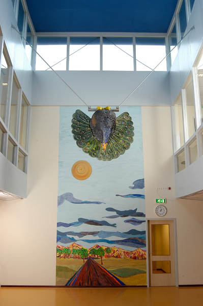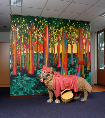 The core of the commission for artist Gijs Assmann was to create a distinctive and recognizable space for the school within the complex. He designed fairy-tale figures such as a monkey stepping out of a melting snowman, a dressed-up wolf, a peacock hanging from a trapeze, and a sleeping bird. These whimsical characters were crafted in ceramics and are arranged throughout the school against a backdrop of mysterious painted landscapes on the walls. Assmann engaged with the school community during the preparations by teaching there to establish closer contact with students and teachers. The project was completed on August 31, 2004, with an additional fifth mural created for the Pedological Institute. A publication with an educational component accompanies the artwork.