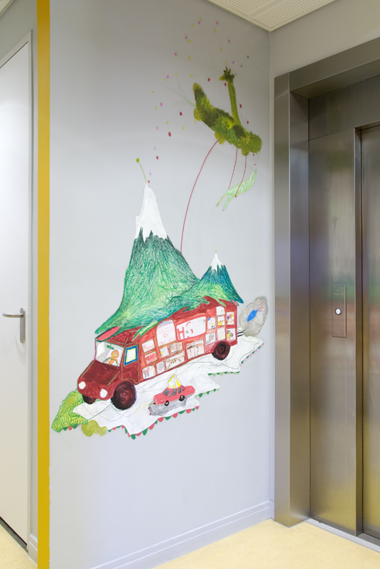 In short workshops with Het Harde Potlood, pupils of De Elout depicted their heroes and heroines on paper. These drawn heroes populate the wall drawings. They form, for example, the passengers of a rocket, or man a truck or submarine. The vehicles full of heroes sail, fly and drive through a world full of rocks, water, planets and clouds. Here and there, strange crops and creatures linger.