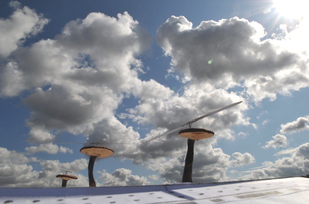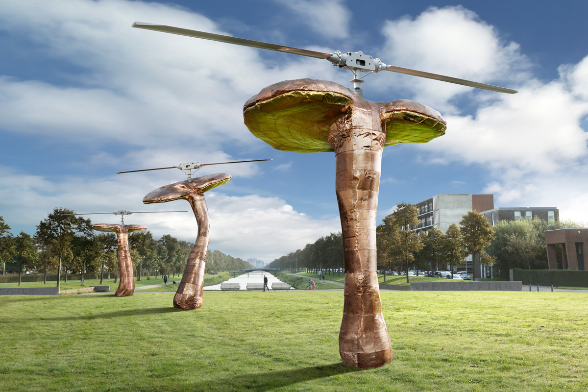 In 2016 the city of The Hague commissioned a work of art in public space in order to celebrate the completion of the newly developed city district Leidschenveen-Ypenburg. During the selection procedure, the city was advised by a committee of local inhabitants and art experts, under the guidance of art center Stroom Den Haag. They chose the design of Huang Yong Ping, because Ling Zhi Helicopters connects the history of the location and the creation of the city district in a highly poetic way. The artist chose the location of the top of the Rijswijkse Landingslaan (the former landing strip of the local airport) for an intriguing and gigantic group of three 'mushroom helicopters'. On the lawn three huge Ling Zhi mushrooms of respectively 5.5 m., 6.8 m. and 6.3 m. high will be erected. When the wind is blowing the 'hats' will gently turn the rotor blades, making it look as if the work has just landed there. From 1936 until 1987 this location was the site of airport Ypenburg. Today it is a lively neighborhood on a historic site that is still very much alive in the memory of many local residents. The monumental work of art thus represents the powerful synthesis of retrospection and progress.