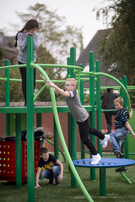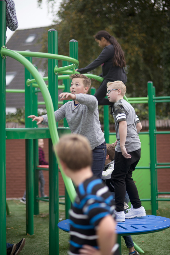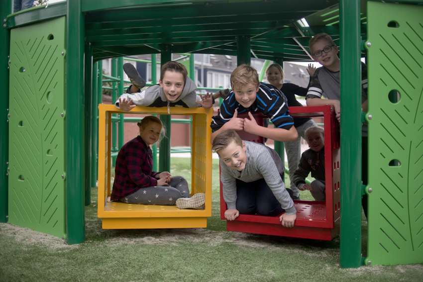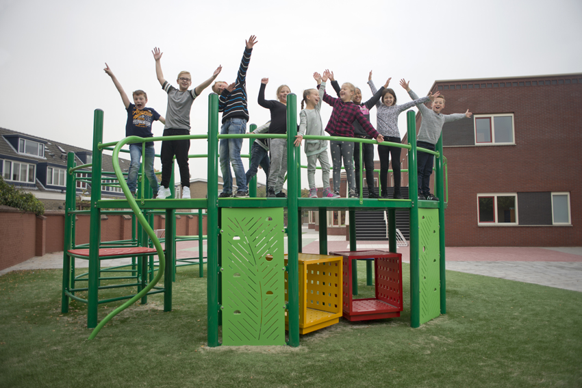 To match the world of the students as closely as possible, a group was included in the art committee. The choice fell on Izabela Boloz, an artist/designer born in Poland and working in the Netherlands since her studies at the Design Academy in Eindhoven. In her designs, she often uses situations in public space, such as waiting, walking and looking. For the Rev. W.E. den Hertog School she made three sketch designs, from which the students could choose. When the site for the artwork had to be determined, it turned out that a climbing apparatus was already planned here. It seemed it would be take it or leave it, but fortunately it didn't come to that. Izabela Boloz and the manufacturer of the climbing apparatus - NOVUM Netherlands - proved able to integrate the standard parts into her design. The students also played with the various elements in a workshop led by Izabela, creating an optimal composition. Afterwards, Izabela still had to work through a thick paper of safety rules. With the help of the climbing apparatus company, she finally managed to put everything together in time to create a unique piece of playground equipment/art.