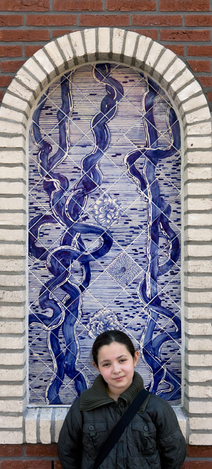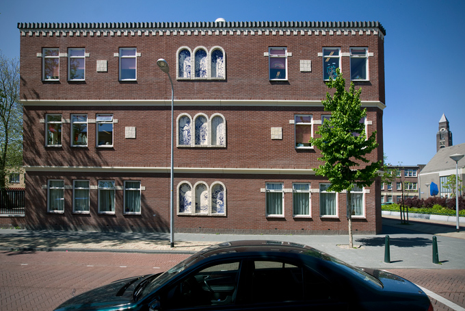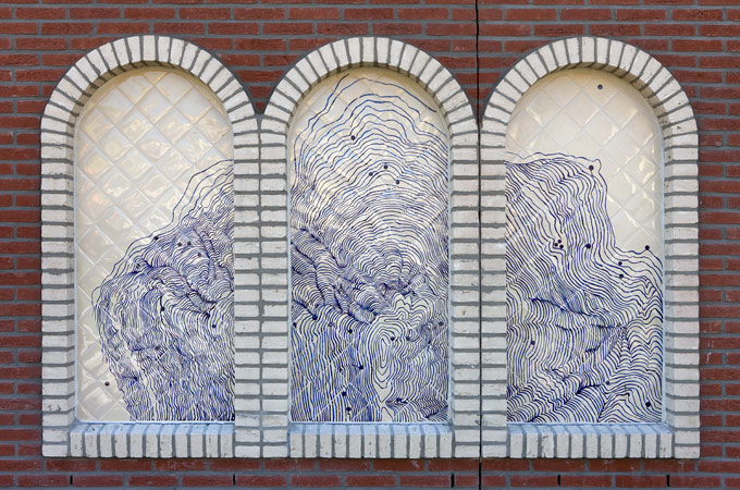 José den Hartog made a special art application of tile tableaux on three facades of the new building of Islamic elementary school Yunus Emre. The architect of the new building had reserved a large number of 'niches' for tile work. José den Hartog has given this an idiosyncratic interpretation; her drawings on the ceramic tiles - mainly blue glass acid drawings on white tiles with some yellow accents - create a dreamy image. In some places you seem to enter an exotic garden; other tableaux depict more abstract motifs.