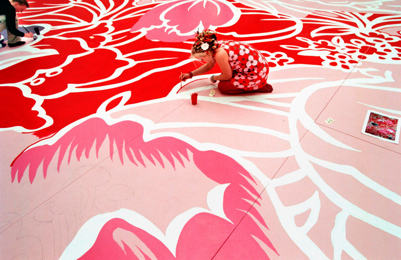 With his enormous floral floor, Michael Lin (b. 1964) deliberately created a functional work of art. The public was allowed to walk across it and organize various activities on it, such as performances, receptions and even exhibitions. The threshold fear of contemporary art was literally removed. Moreover, the unique location of the Atrium made it possible to view the impressive painting from above.