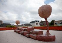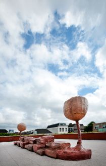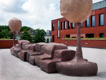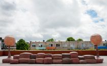 On the roof of the Johan de Witt College the Spanish artist/designer Nacho Carbonell has installed a huge flesh-coloured bench. Like in a living room, the cushions are waiting for the children of the school to use them. When it gets dark two moon-shaped bulbs lighten up this rooftop square, from where you have a great view of the skyline of The Hague.