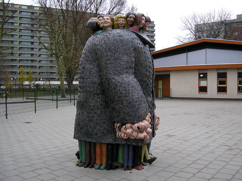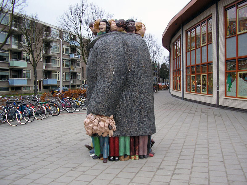 For the new building of De Jonge Wereld, Paul de Reus was asked for an art application for the outdoor space. The art committee gave as keywords for the commission: a cheerful, playful work in the otherwise dull street.The work had to be challenging, energetic and exciting but also safe, reliable and warm.The art committee chose Paul de Reus because of the narrative aspect of his work and its quirky humor.The almost classical, monumental, painted bronze sculpture depicts a giant coat with herringbone pattern in which many children are hidden .The sculpture, 3 meters high and 1 1/2 meters wide, is placed at the edge of the schoolyard.