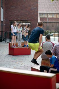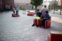 The benches are all connected by means of an underground hydraulic system. When you sit on a bench it will slowly lower you down to the ground. At the same time, on another bench in the schoolyard the exact opposite is happening. Because the benches are connected, very user becomes aware of his or her location. This creates an opportunity to communicate.