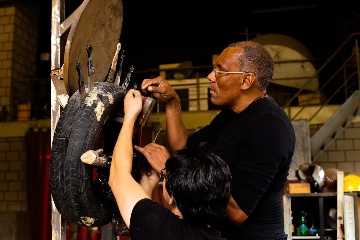 The sculpture is largely cast in bronze with a few components of concrete and rubber. In het werk spelen alledaagse objecten de hoofdrol. In his sculptural work, everyday objects play a prominent role. By taking these objects out of their usual context, the artist invites the viewer to rediscover their true meaning. Martha's use of objects such as a barbecue, Afro combs and a piss pot encourage us to come up with hidden associations.