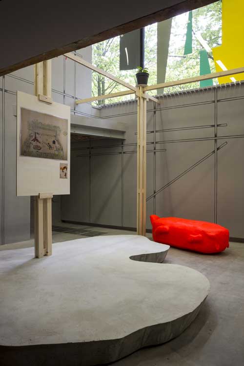 Mariana Castillo Deball and Manuel Raeder are inspired by the drawings Bo Bardi's made for her buildings. The colourful and playful sketches are in sharp contrast to conventional architectural drawings with their mathematical precision and architectural details. They contain an atmosphere, trees, plants, animals and insects, and instructions for different functions. Deball and Raeder designed a number of animal-shaped seating sculptures, built in paper mache by a local artist. They are a statement for craftsmanship versus mass production.