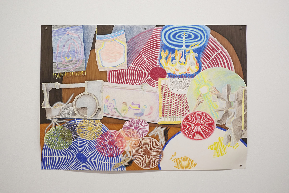 López' work starts with the creation of spatial installations/ sites/ sets with a mixture of objects. These spatial compositions are then translated into drawings, and - from those drawings - new installations are built, which often are then drawn again, from which further installations are made. This process of relocation and re-iteration can go on for a long time, and often continues from work to work. Therefore it is very much a process of translation between mediums, meanings and dimensions that help untangle and digest references, ideas and feelings.