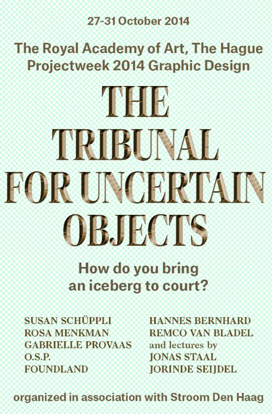 Between 27 and 31 October 2014, the Graphic Design Department of the Royal Academy in The Hague organizes its yearly projectweek. This edition is called The Tribunal For Uncertain Objects (How do you bring an iceberg to court?), and is organized together with Stroom Den Haag and Canadian artist Susan Schüppli in the context of See You in The Hague.