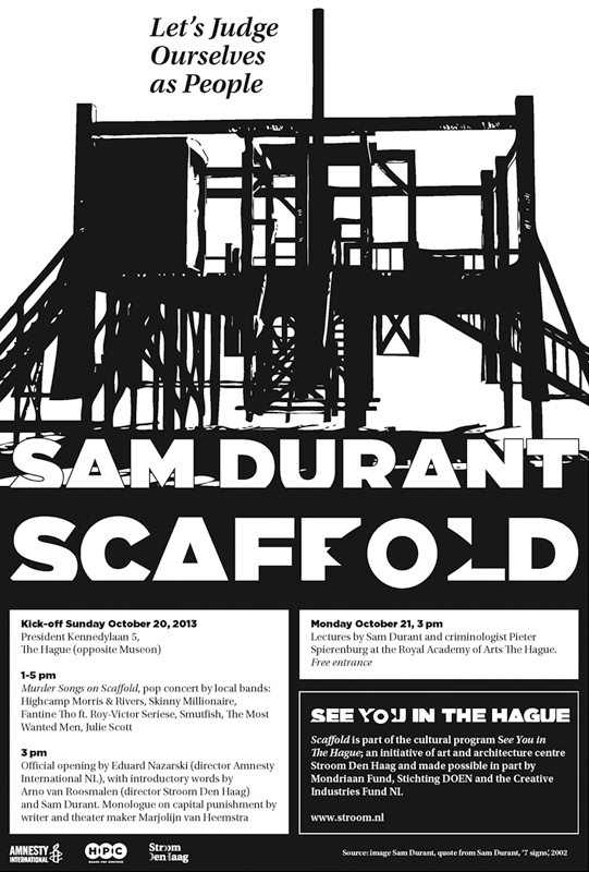 The presence of institutes that are concerned with justice and security were the reason behind the decision of Sam Durant and Stroom Den Haag to rebuild Scaffold in The Hague, in the International Zone of the city. In concurrence with the program See You in The Hague the work will be literally activated as a platform for discussion about the death penalty, democracy, national administration of justice and international criminal law. A public program will turn Scaffold into a platform for discussion and reflection.