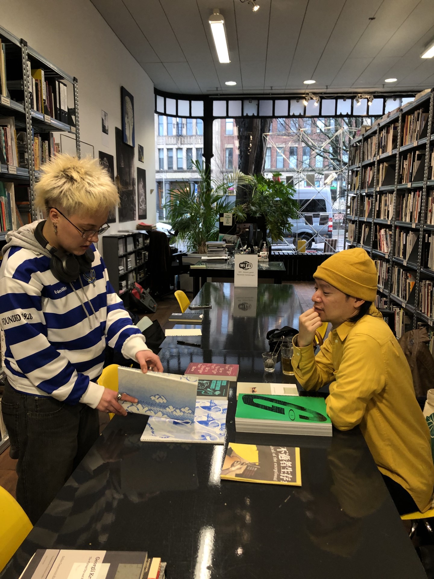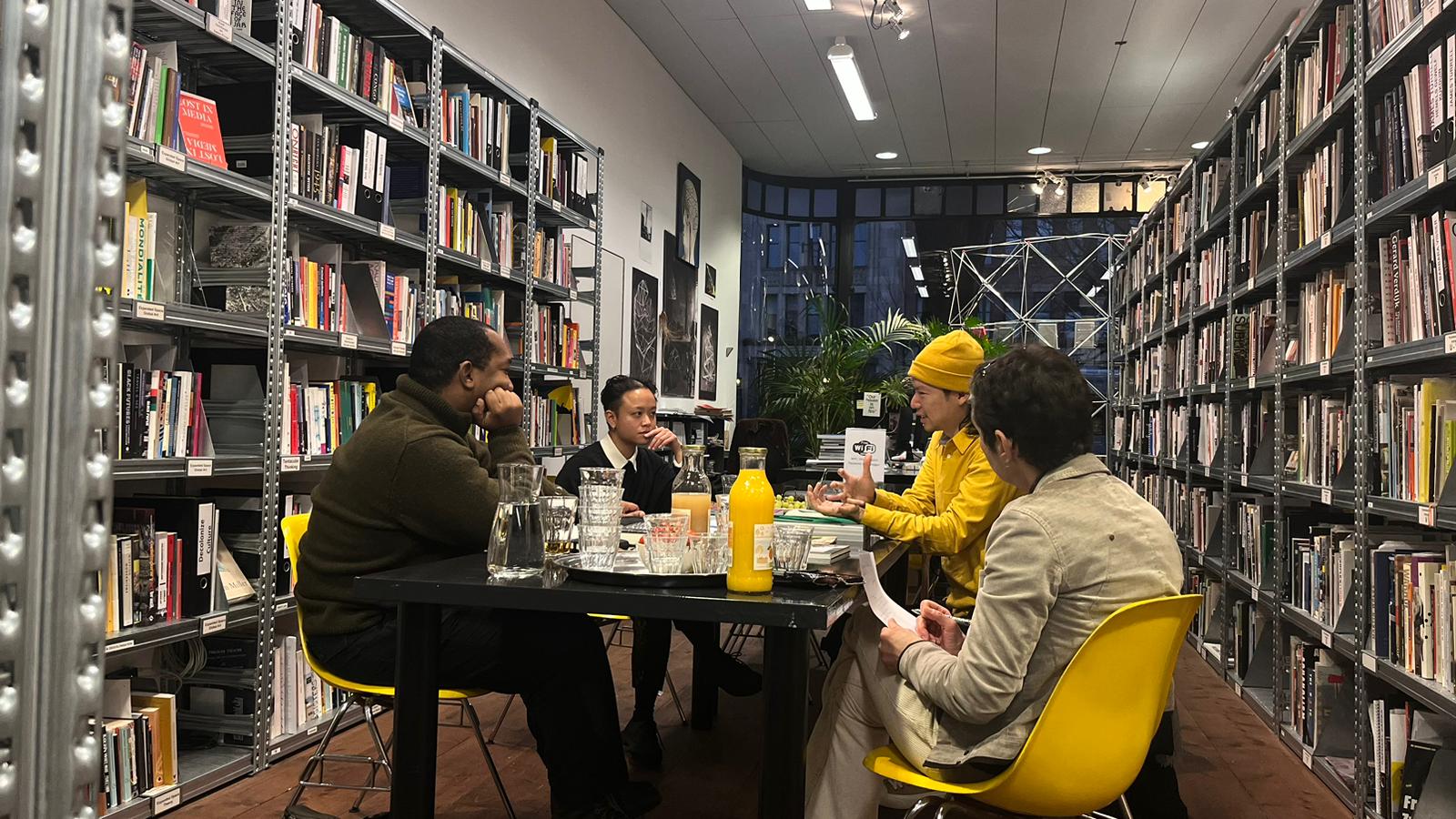 On a dark, wet Sunday afternoon, an ideal time for a good conversation, Liang-Kai Yu is our main guest. As a regular visitor to our Stroom library, the Taiwanese PhD researcher, curator, writer and co-founder of Limestone Books in Maastricht, had already recommended several interesting books for our collection. It was the reason to ask him whether he would like to meet more artists in The Hague, who would probably be very interested in his research and practice. Conversely, for Liang-Kai, who has lived here for quite some time already, but does not yet know many people from The Hague's artistic field, it is a nice opportunity to enlarge his network and knowledge. So we are with a small group. However, experience has shown that fruitful encounters also arise in small sessions. Once again, this was the case.