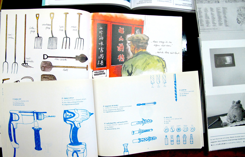 The big surprise of the many books that were on the table this afternoon wasTe Hooi En Te Grasby Rien Poortvliet. This immensely popular Dutch draftsman is famous for his nostalgic depictions of a past that never was. Certainly not the expected inspiration for a conceptual artist! But in the exchange of ideas during the session it became more and more clear that in the network of Nishoko's fascinations there are several strands that connect Rien Poortvliet's depictions of daily life with her love for picture manuals, and creative misunderstandings of foreign languages. Seen through her eyes the drawings of Rien Poortvliet could be part of the everlasting Japanese cult magazineNote for Lifein which good housekeeping is lovingly propagated in exquisite detail. Here you can find ‘the real thing' in contrast to the fashionable interior and outdoor magazines, which are full of propaganda for the hipster - fake - lifestyle.