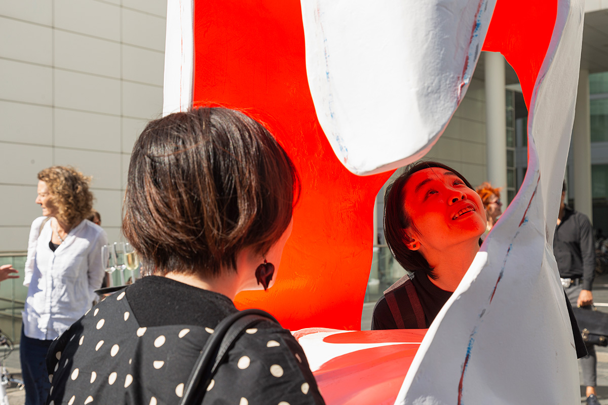The exhibition title - To Be To Gather - refers to both a gathering place and a state of mind. The work has a tubular structure - it is hollow on the inside - and invites you to insert your arms and head. After doing so, whatever you see or experience actually differs from one person to the next. You may feel like breaking out into song, or listening to the sounds of the city. Or you may decide it's a perfect setting for a private conversation. It's all up to you, the visitor.