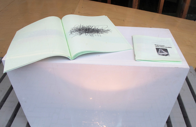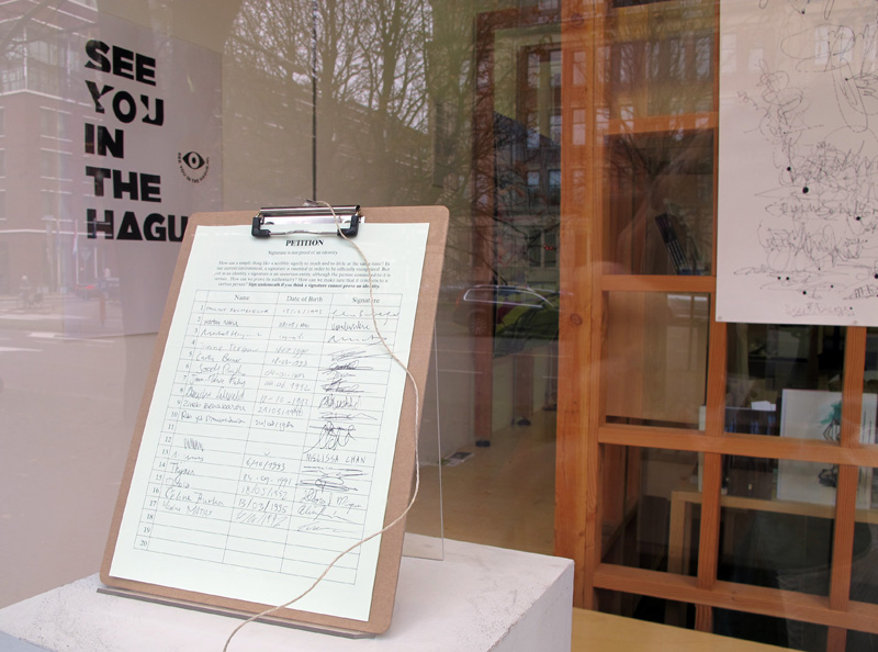 Every year the Royal Academy of Art The Hague (KABK) and Stroom Den Haag organize a project week under the title On Responsibility. This year's objective was to answer the question "How do you bring an iceberg to court?" The week was organized in collaboration with Susan Schuppli and part of the program See You in The Hague. This mini-exhibition was the award-winning entry of a group of graphic design students (from all four years) who discussed the insignificance of a signature.