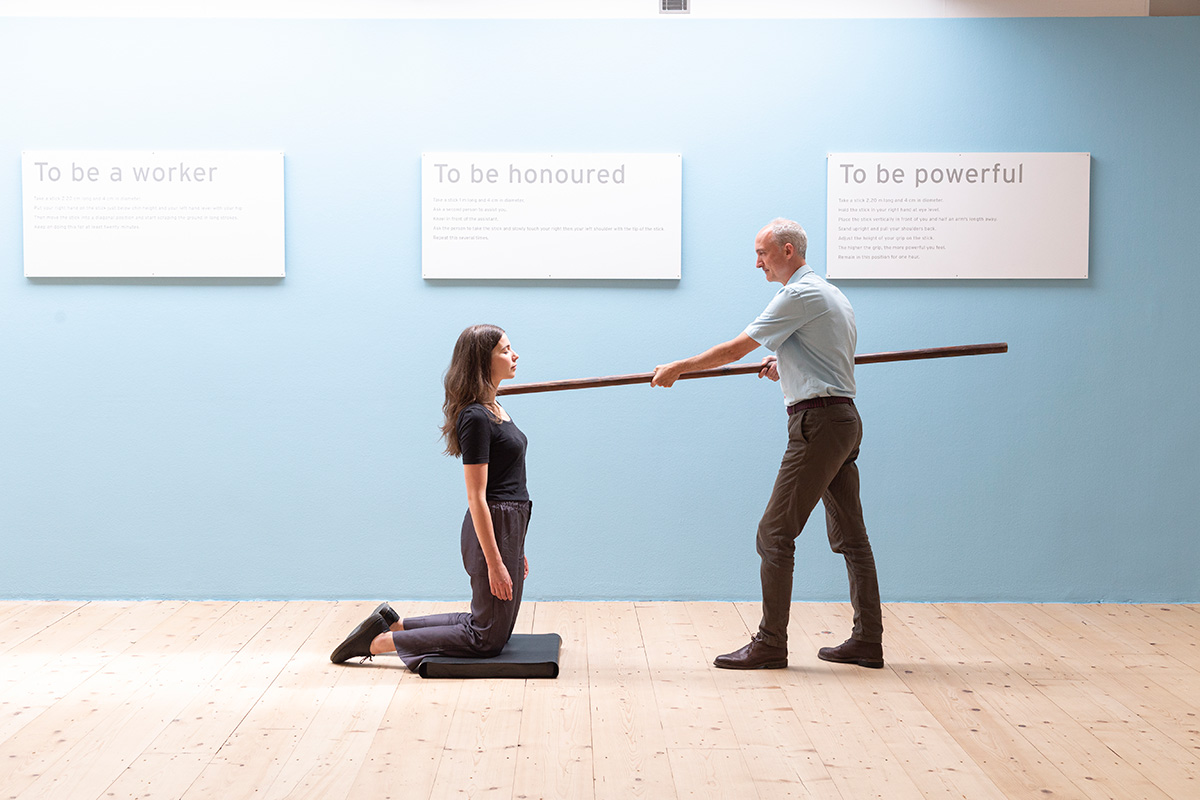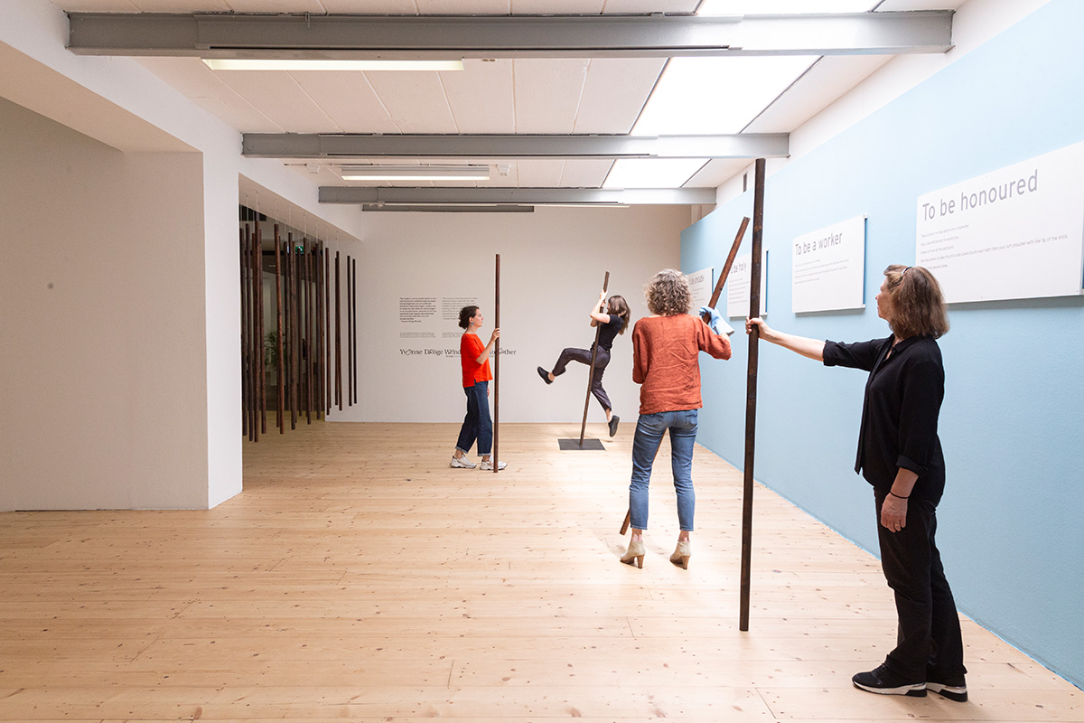 At Stroom, the public is invited to relate to the works in the exhibition in a playful and accessible manner. Dröge Wendel creates a collection of contact moments in which every action forces you to focus on your relationship to the space and the work. Some works of art are still in the process of becoming, or their role seems undetermined. In the work It makes you feel (2004), for example, visitors are invited to use a wooden stick with the help of various manuals. The question here is what happens when you use this specific stick in this specific way. The Black Ball (2000-ongoing) is a felt ball with a diameter of 3.5 meters that balances between monumentality and caressability. Other works also encourage further contact such as Hospital (1992), Wooden Sticks (1996) and Furniture for a Think Tank (2010-ongoing), and arise through changing constellations and questioning. All are ongoing exercises in encounters.