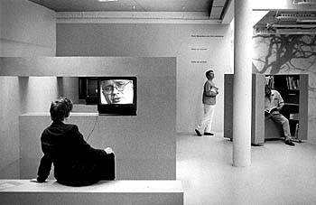 Een zitmeubel als boekenkast, een chaise longue met gesproken tekst en lichtbakken met beeldmateriaal en een video station, waar men vanaf verschillende banken video-banden kon bekijken. De bezoekers maakten hierdoor deel uit van deze presentatie.