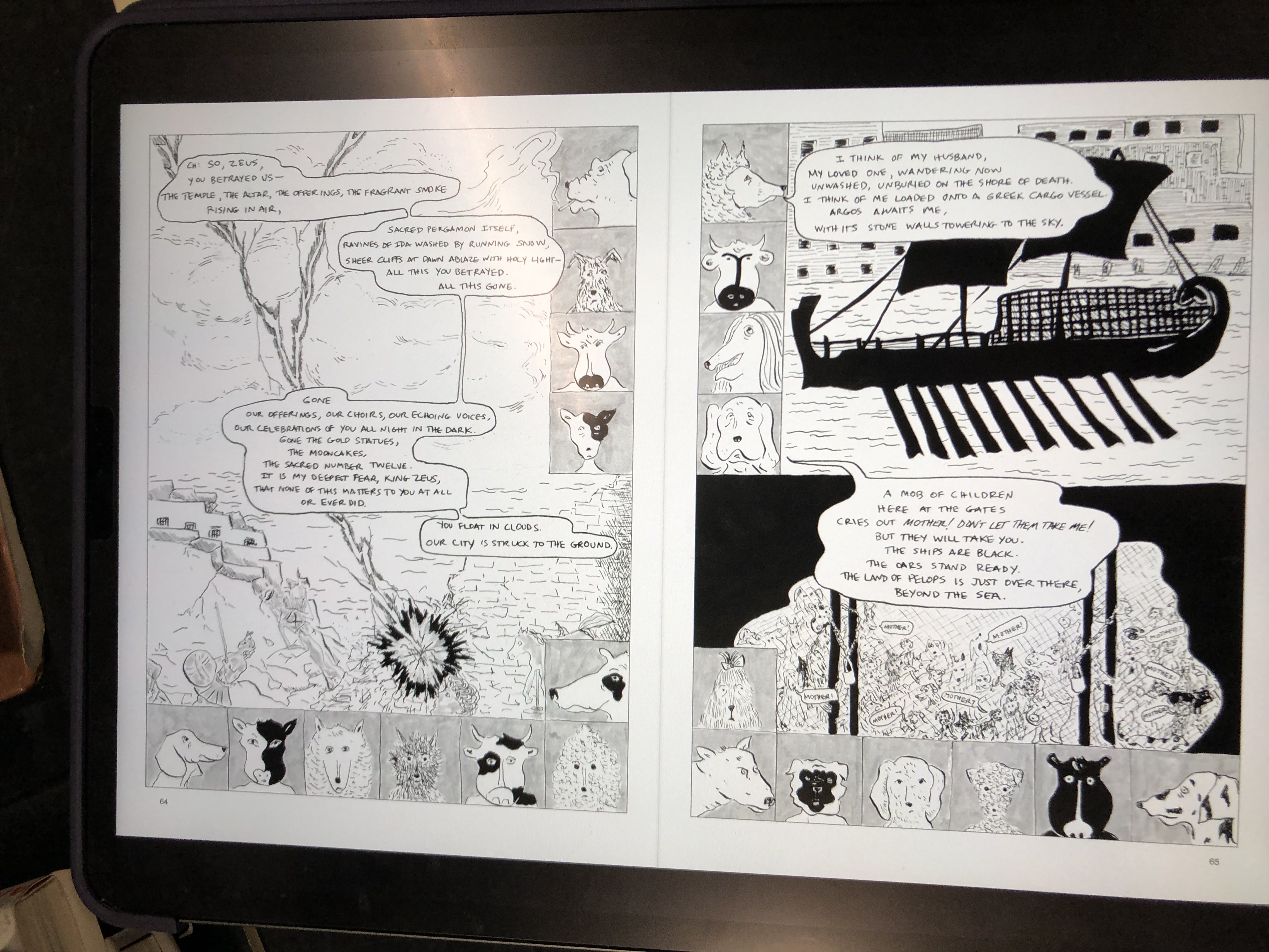Ghazale Moqanaki The Trojan Women / text by Anne Carson ; ill. by Rosanna Bruno. - Northumberland : Bloodaxe, 2021. - 90 p. : ill. ; 30,5 cm ISBN: 9781780375908 This comic-book version of Euripides’ classic The Trojan Women follows the fates of Hekabe, Andromache and Kassandra after Troy has been sacked and all its men killed. The Trojan Women is a wildly imaginative collaboration between the visual artist Rosanna Bruno and the poet and classicist Anne Carson. Both wacky and devastating, the book gives a genuine representation of how human beings are affected by warfare. All the characters take the form of animals (except Kassandra, whose mind is in another world).