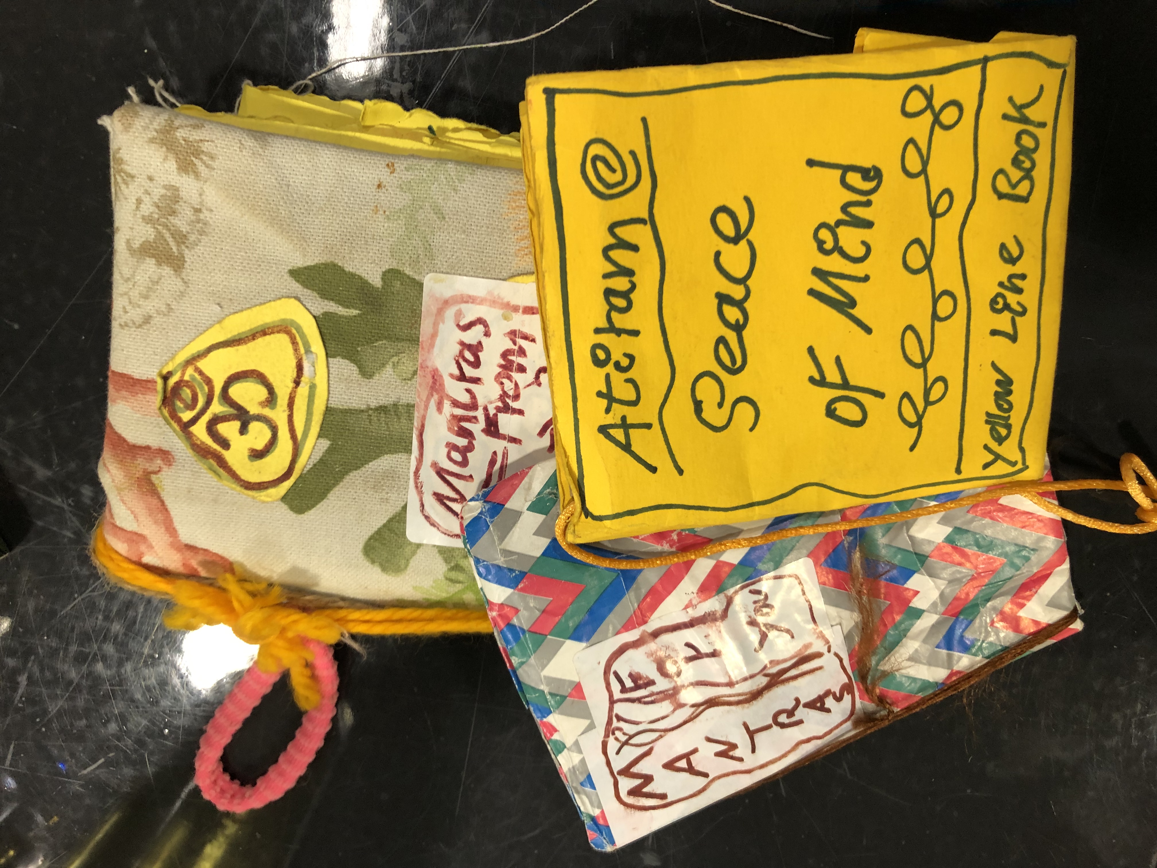 Shani Leseman Atitam, Peace of Mind (Yellow Line Book) ; Mantras from A – Z ; Mantras for You / anoniem. - s.l. [Ibiza?] : in eigen beheer, jt onbekend. - 3 gebonden boekjes, ongepagineerd : ill. ; ca 18 cm “De maker heb ik ontmoet op een vlooienmarkt op Ibiza. Zijn uitgangspunt was denk ik vooral het delen van zijn kennis, of aangezien hij zelf niet centraal stond, als een soort doorgeefluik van spirituele kennis. Er staan wat verwijzingen in naar het Vaishnavisme maar er staan ook meer persoonlijke teksten in.” (SL)