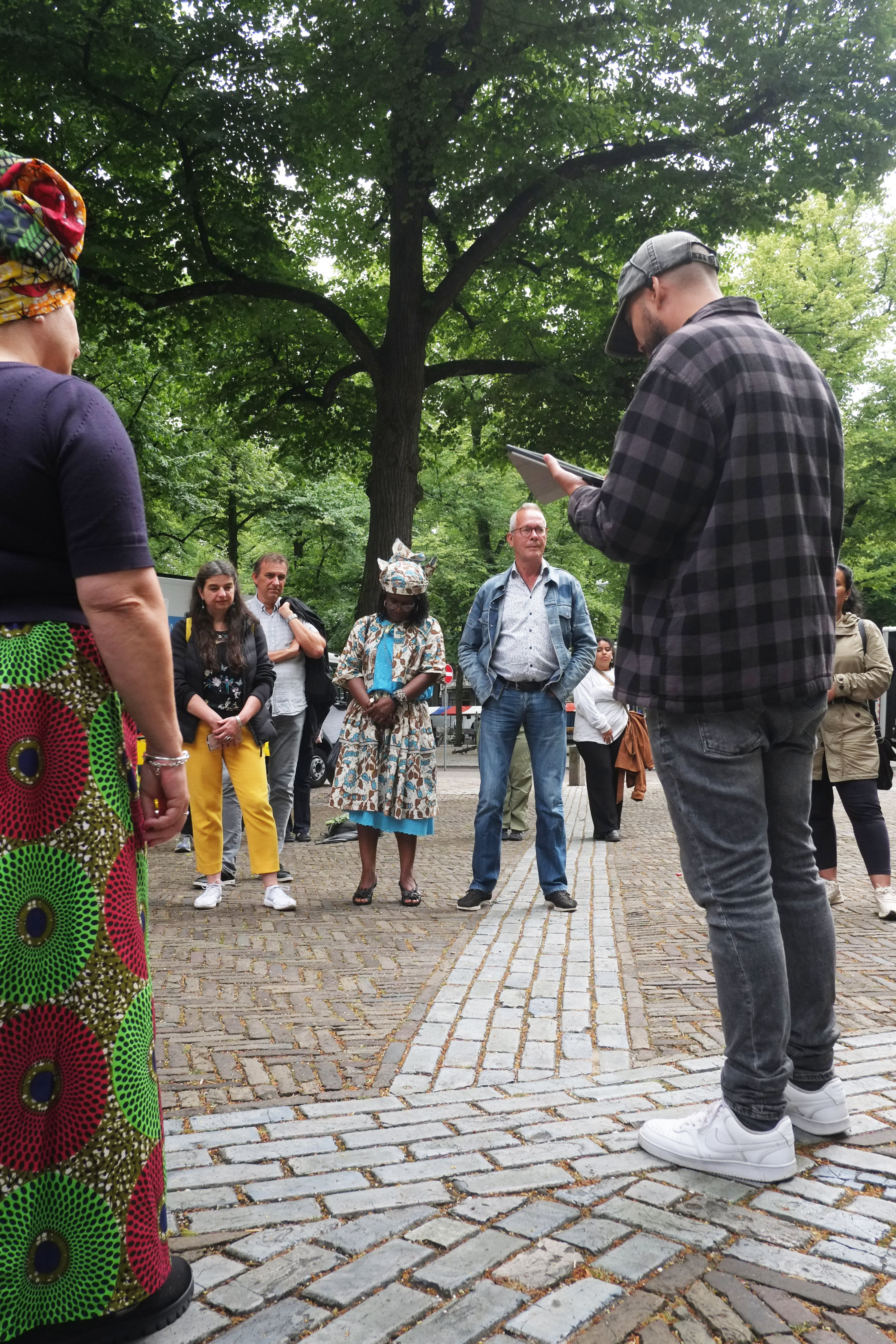 Spoken word bijdrage door InsaynoOp het Lange Voorhout geeft woordkunstenaar Insayno een spoken word bijdrage ivm het Trans-Atlantisch Slavernijmonument.