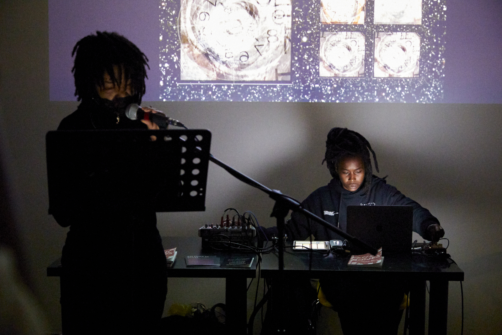 Black Quantum Futurism is a collaboration between Camae Ayewa (Moor Mother) & Rasheedah Phillips. They will present an immersive performance in response to the themes of Towards a Black Testimony of which sound is a central element. Their performances include voice, the live composition of electronic music and noise, film and three dimensional setting. BQF is a new approach to living and experiencing reality by way of the manipulation of space-time in order to see into possible futures, and/or collapse space-time into a desired future in order to bring about that future's reality. This vision and practice derives its facets, tenets, and qualities from quantum physics and Black/African cultural traditions of consciousness, time, and space.