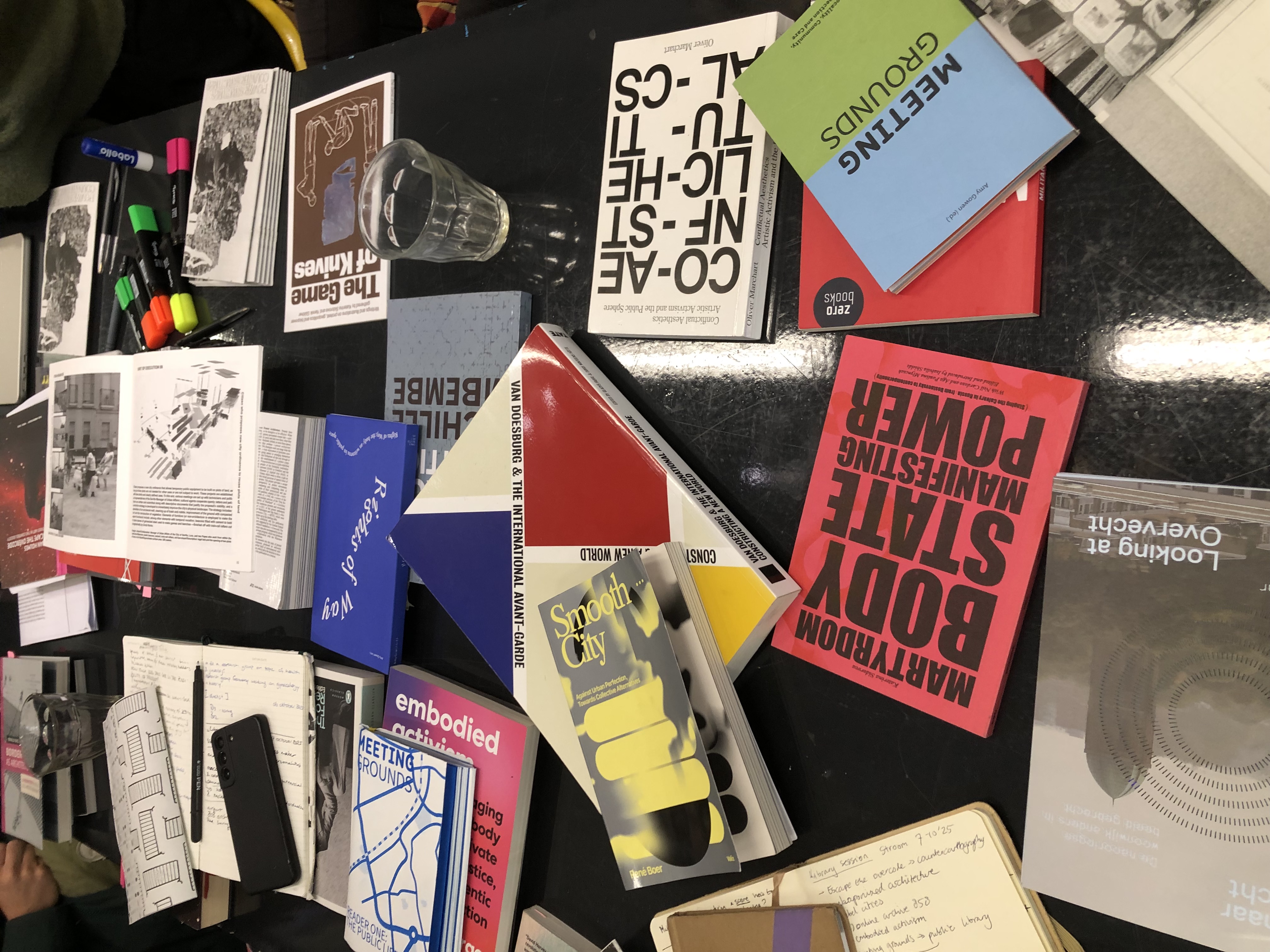 Daarom werden niet alleen boeken uit Katerina's eigen collectie besproken, waaronder Embodied Activism en Rights of Way, maar ook een brede selectie uit de Stroom Bibliotheek, zoals Protest Architecture en Rebel Cities van David Harvey, en haar eigen boeken, waaronder Martyrdom, Body, State, Manifesting Power en The Game of Knives. Voorafgaand aan de sessie heeft Katerina een zine gemaakt met citaten van denkers die voor haar belangrijk zijn, zoals Foucaults gedachten over de introductie van de term biopower, stukken uit Hobbes' Leviathan en Revolution without Revolutionaries, van Asef Bayat, die in dit boek over de Arabische lente, beschrijft hoe rotondes, door staten bedoeld als functionele infrastructuur, podia van verzet werden. (Opmerkelijk detail: door het Malieveld in Den Haag aan te wijzen als goedgekeurde plek voor demonstraties, heeft de staat ervoor gezorgd dat mensen de kans krijgen om zich uit te spreken, zonder dat dit opvalt en zonder dat dit enige verstoring in de stad veroorzaakt).