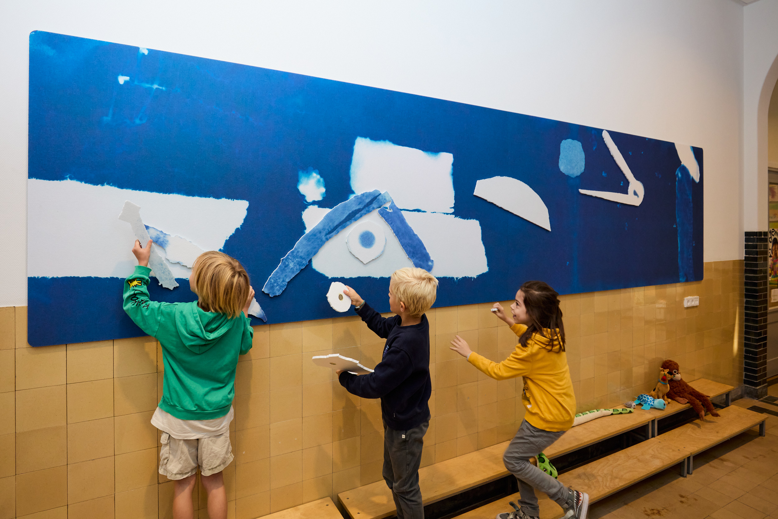 Afgelopen vrijdag 18 oktober onthulde de directeur van Openbare Basisschool Galvani onder luid gejuich van de leerlingen, de ouders en andere belangstellenden een nieuw kunstwerk van de Haagse kunstenaar Sarah Carlier. Het project maakt deel uit van het programma Kunst bij Scholen waarbij Stroom Den Haag al decennialang kunstenaars verbindt aan Haagse scholen. Carlier is voor dit werk op zoek gegaan naar sporen in de buurt van de school en in de school zelf. De vondsten hebben geleid tot een workshop met de leerlingen en zijn verwerkt in blauwdrukken die weer terugkomen in het uiteindelijke kunstwerk. Eerder was Carlier's voorstel met de blauwdrukken bij Stroom te zien in de tentoonstelling Speelruimte, waarbij het Kunst bij Scholen programma centraal stond.