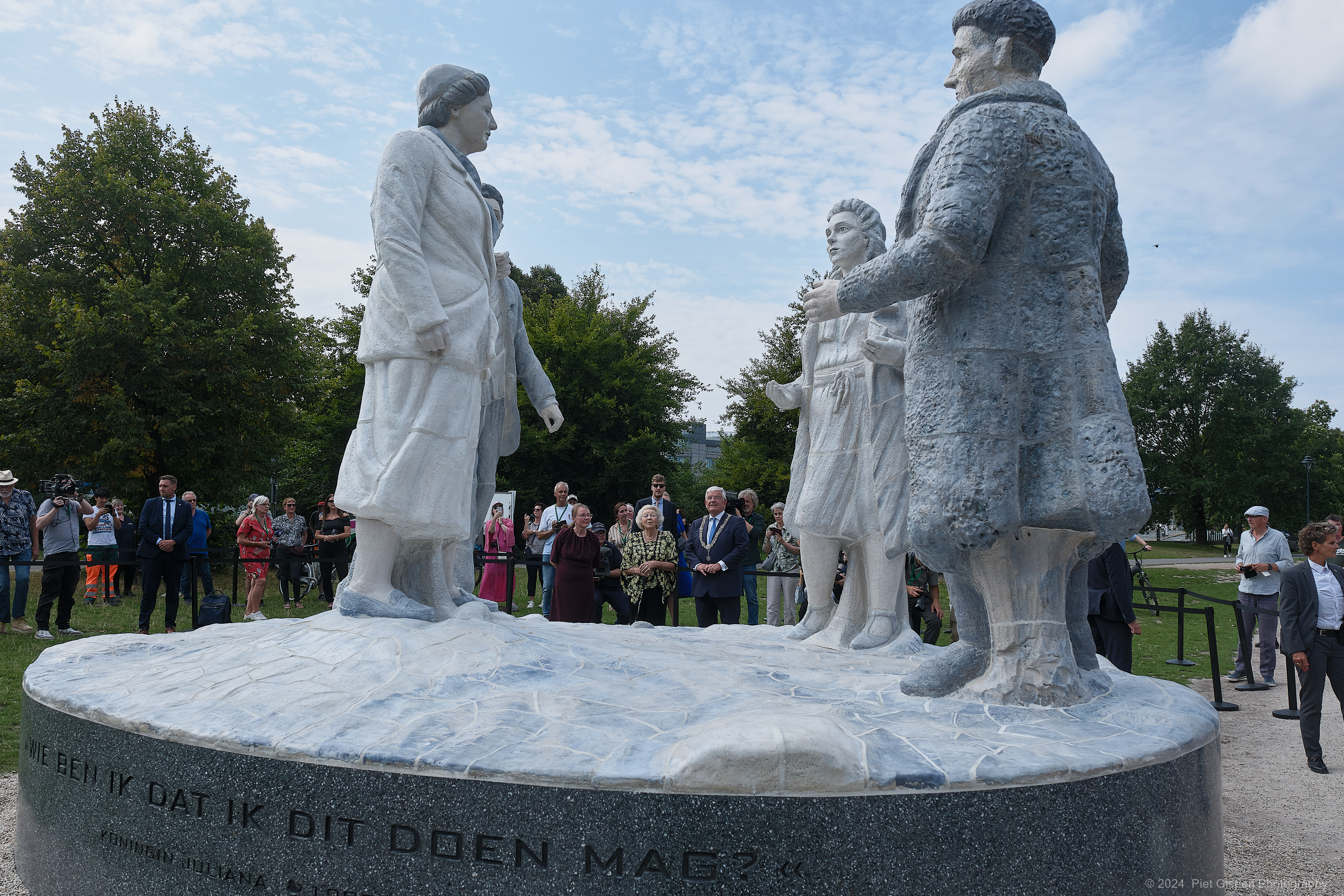 Maandagmiddag 2 september 2024 onthulde Prinses Beatrix, in aanwezigheid van burgemeester Van Zanen, de beeldengroep ter herinnering aan Koningin Juliana. Het is een werk van kunstenaar Ingrid Mol en bestaat uit vier figuren, waarbij Koningin Juliana is geportretteerd terwijl ze een werkbezoek aflegt. Het monument, in opdracht van de Haagse gemeenteraad, staat op de Koekamp vlakbij het Centraal Station. Ingrid Mol studeerde tot 1993 autonome vormgeving aan de KABK in Den Haag. De kunstenaar gaf tijdens de onthulling nadrukkelijk aan dat ze de vorstin wilde verbeelden “als een sociale vrouw in gesprek met mensen… gewone mensen.” Voor meer informatie over het werk klik hier.